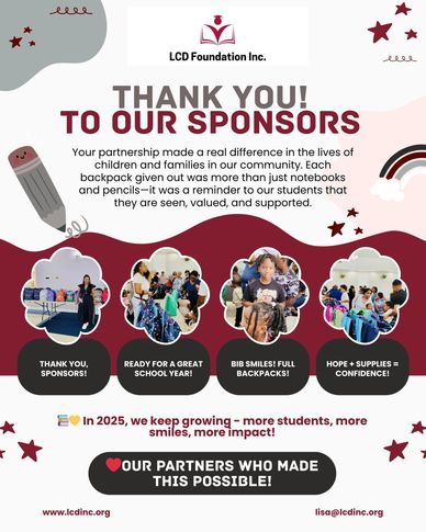 The LCD Foundation Inc. is proud to celebrate the incredible sponsors who make our initiatives a success! Because of their generosity, hundreds of students walked away with backpacks, supplies, and the confidence to start the new school year strong.